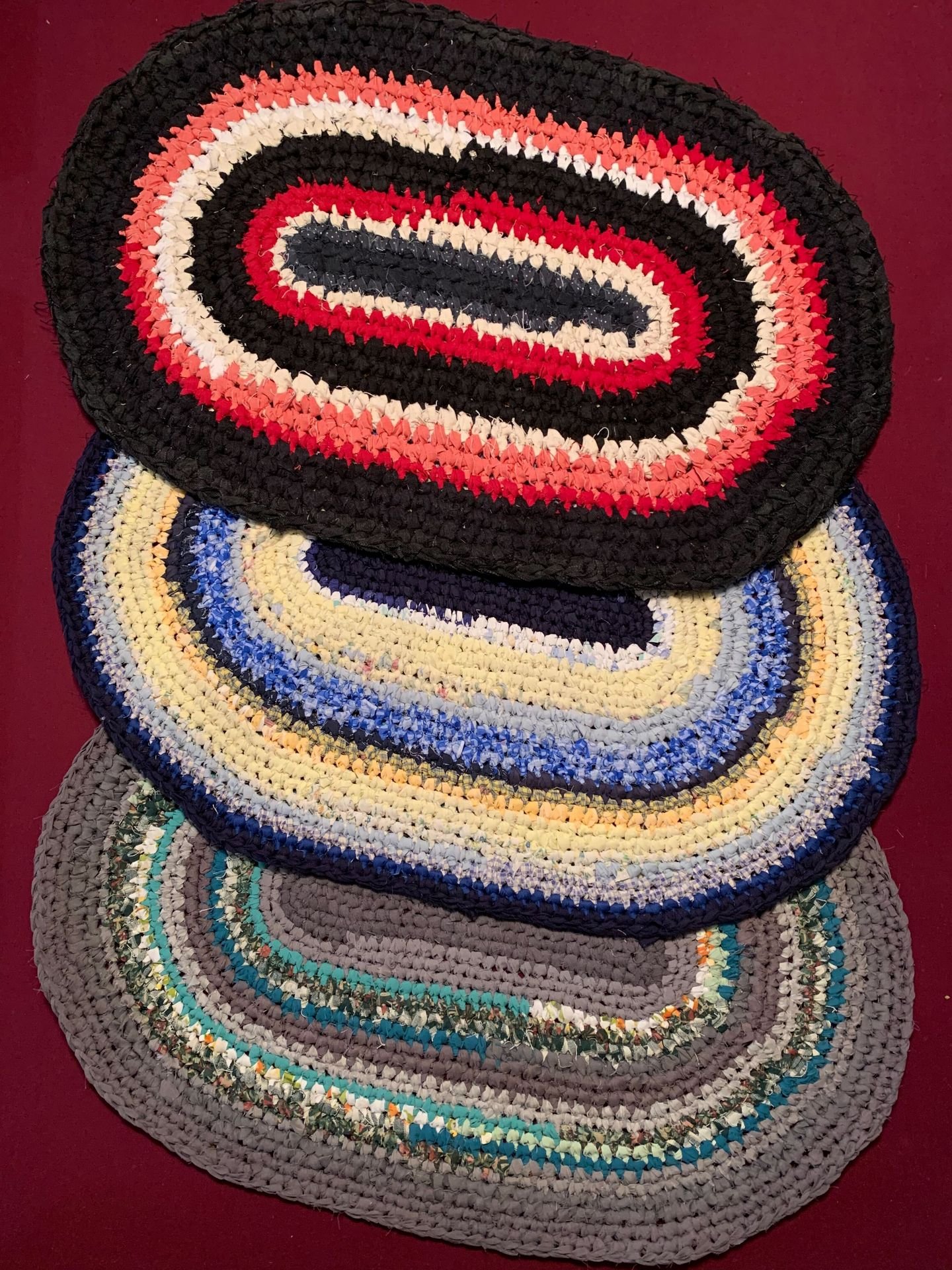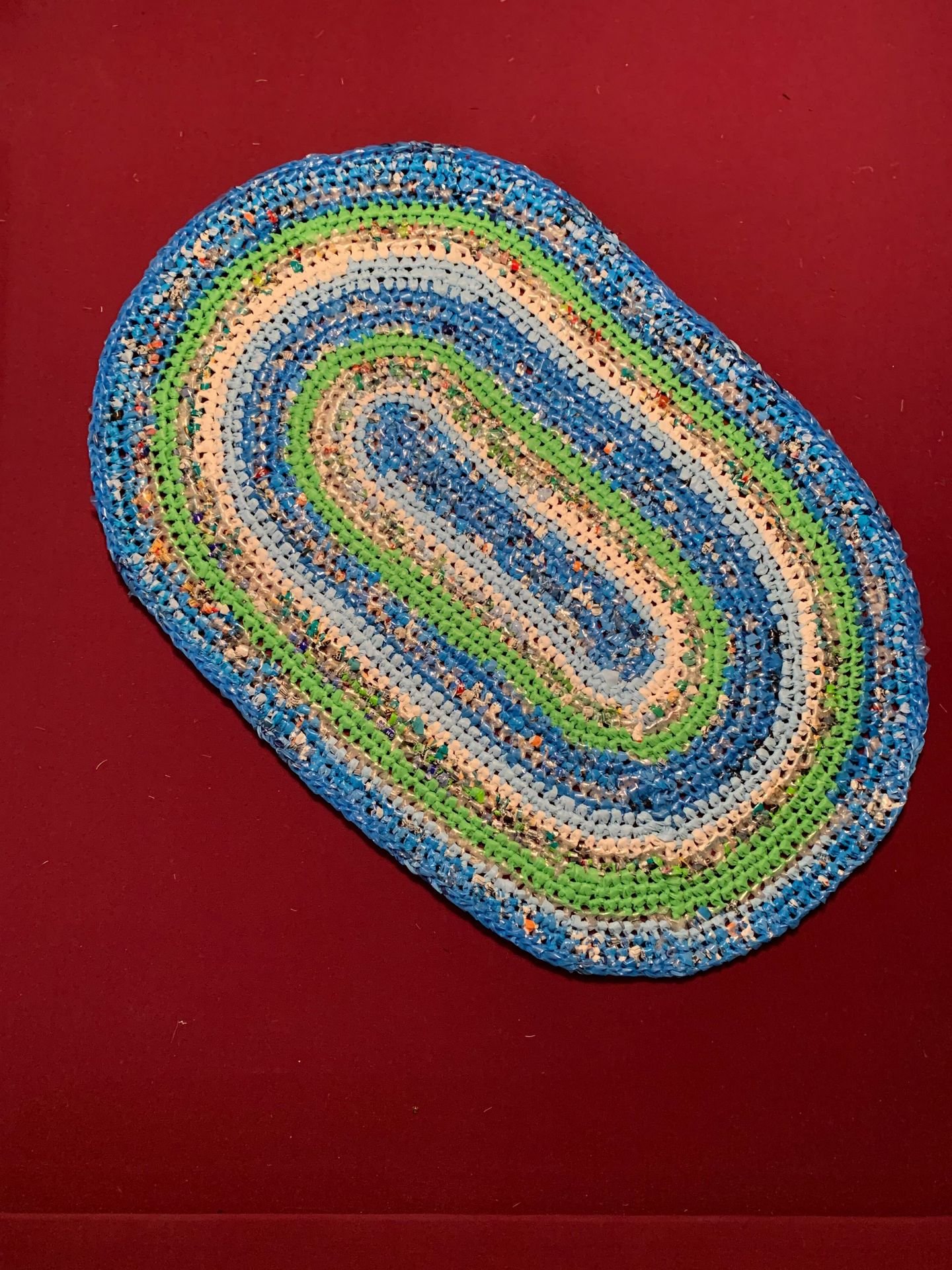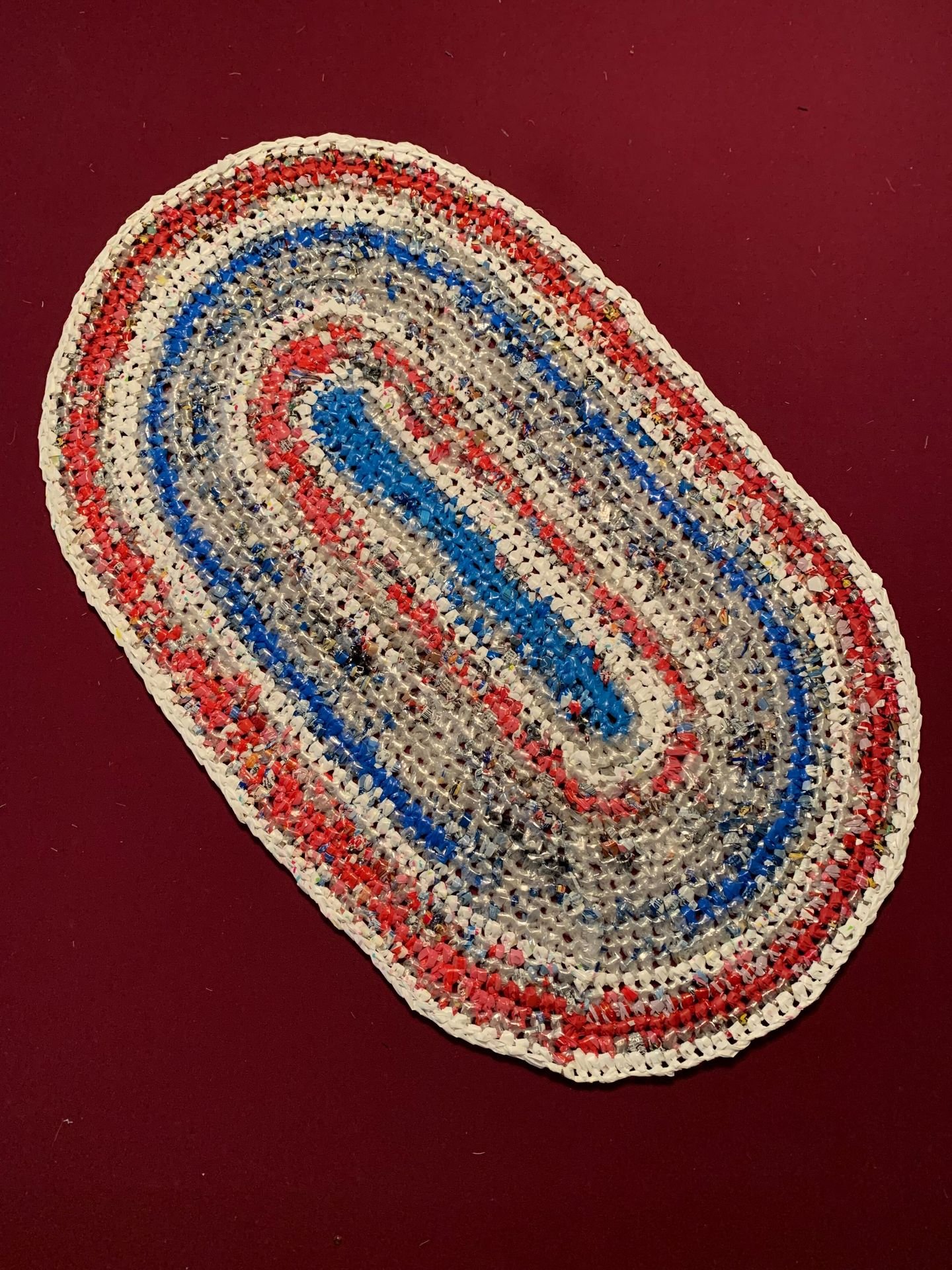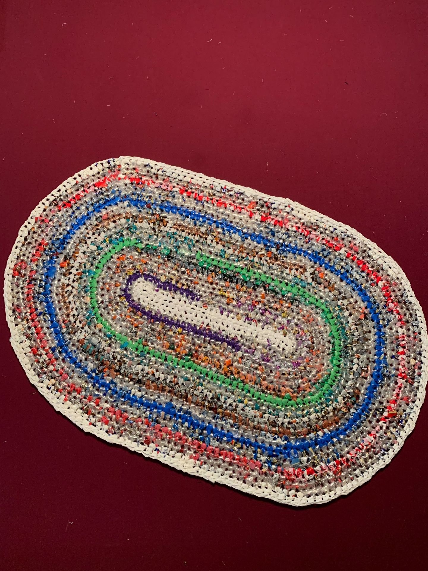 Did you ever think you could recycle plastic bread sacks, vegetable bags, and tablecloths? These 2'x3' colorful plastic rugs are a great fit for bathrooms and porches.